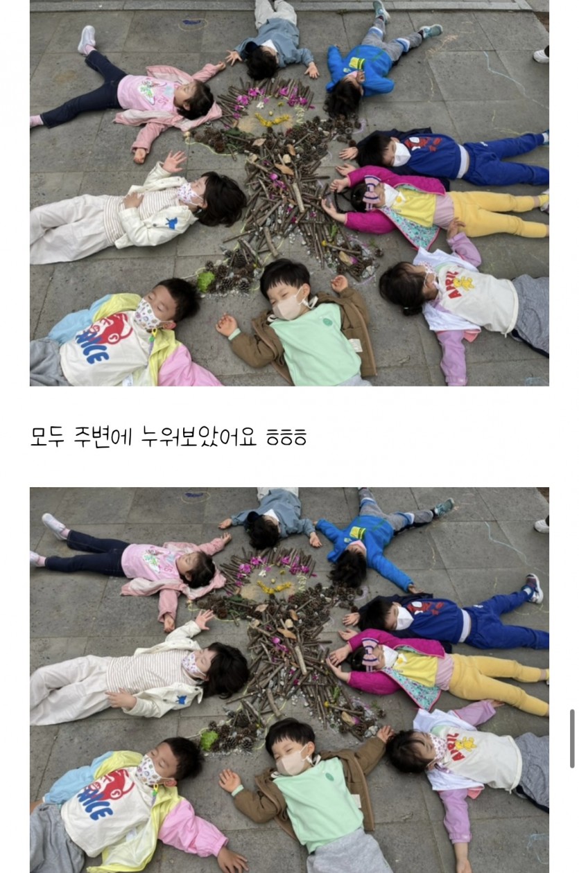 나뭇가지도 가져오며 민들레고 가져오며 솔방울도 가져오며